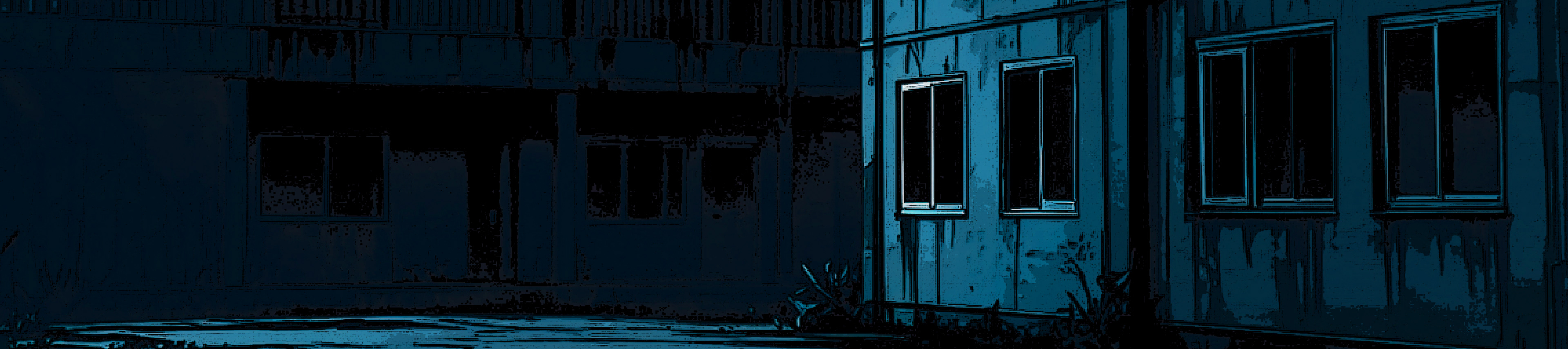 En este entorno, Hoki, la protagonista, deambula con su uniforme escolar desgastado y rasgado, su postura reflejando vulnerabilidad y soledad. La tensión se intensifica con el contraste entre la oscuridad envolvente y los destellos de luz cálida a lo lejos, creando un efecto de atracción y miedo hacia lo desconocido.